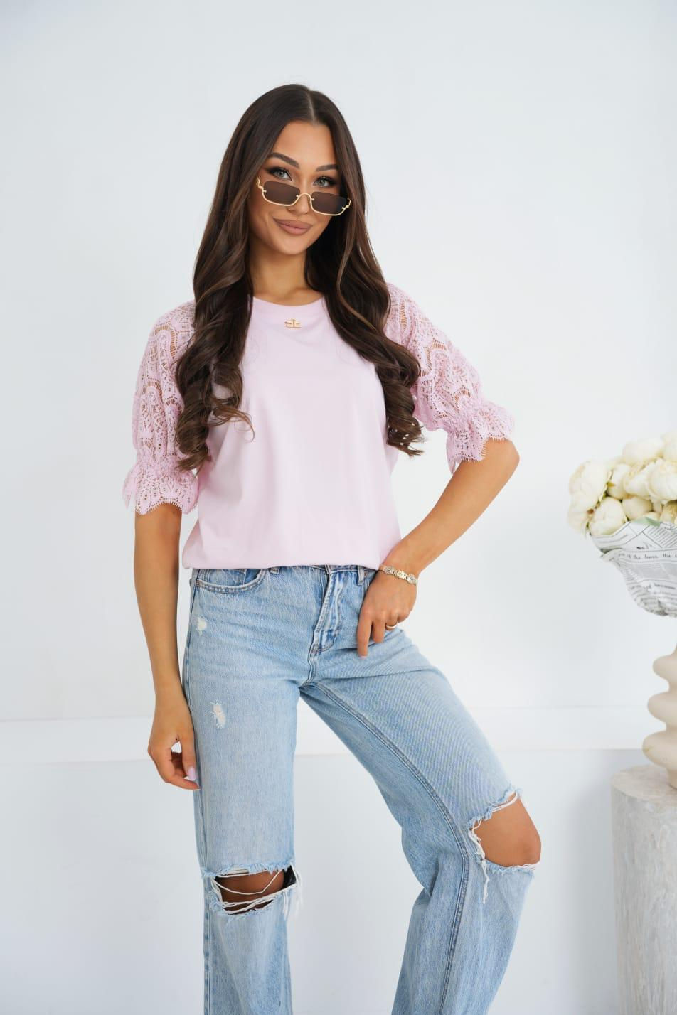 Bluzka pastelowy róż z koronkowym rękawem